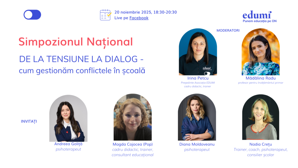 Ne revedem pe 20 noiembrie la Simpozionul Național „De la tensiune la dialog – cum gestionăm conflictele în școală”, un eveniment organizat de Asociația EDUMI, dedicat cadrelor didactice și tuturor celor preocupați de climatul relațional din școală și de construirea unor comunități educaționale bazate pe respect și colaborare. Discutăm onest despre ceea ce se întâmplă în cancelarie și în clasă: de la tensiuni între adulți la conflicte între copii, de la burnout la nevoia de cooperare și sprijin reciproc.